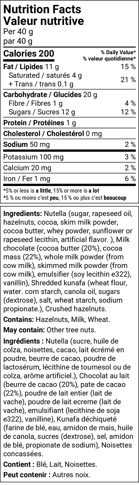 Introducing our Chocolate (Hazelnut Spread) Knafeh Chocolate Bar – a delicious blend of rich, velvety chocolate and the exotic flavours of traditional Middle Eastern knafeh. Each bar features a smooth chocolate shell and creamy yet crunchy Chocolate Hazelnut knafeh centre. Available in Milk or Dark chocolate.