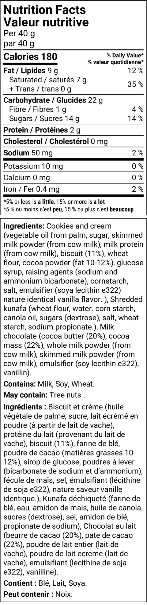 Introducing our Cookies N' Cream Knafeh Chocolate Bar – a delicious blend of rich, velvety chocolate and the exotic flavours of traditional Middle Eastern knafeh. Each bar features a smooth chocolate shell and a crunchy Oreo knafeh center. Available in Milk or Dark chocolate.