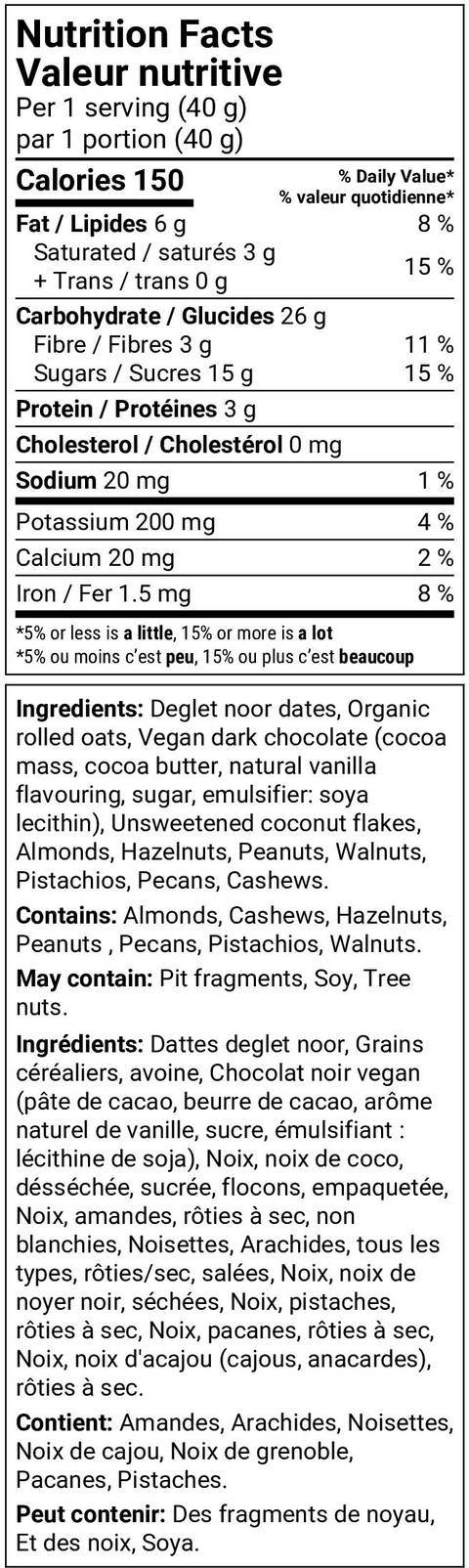 Palm Bites Knafeh Power Mix is a delicious mix perfect for breakfast or a snack on the go. It contains Rolled Oats, Dates, Knafeh Chocolate and a Nut Mix to help you power through the day. This product is rich in fibre, protein, Omega 3's and antioxidants. It's also a great addition to your smoothie bowls and yogurt.
