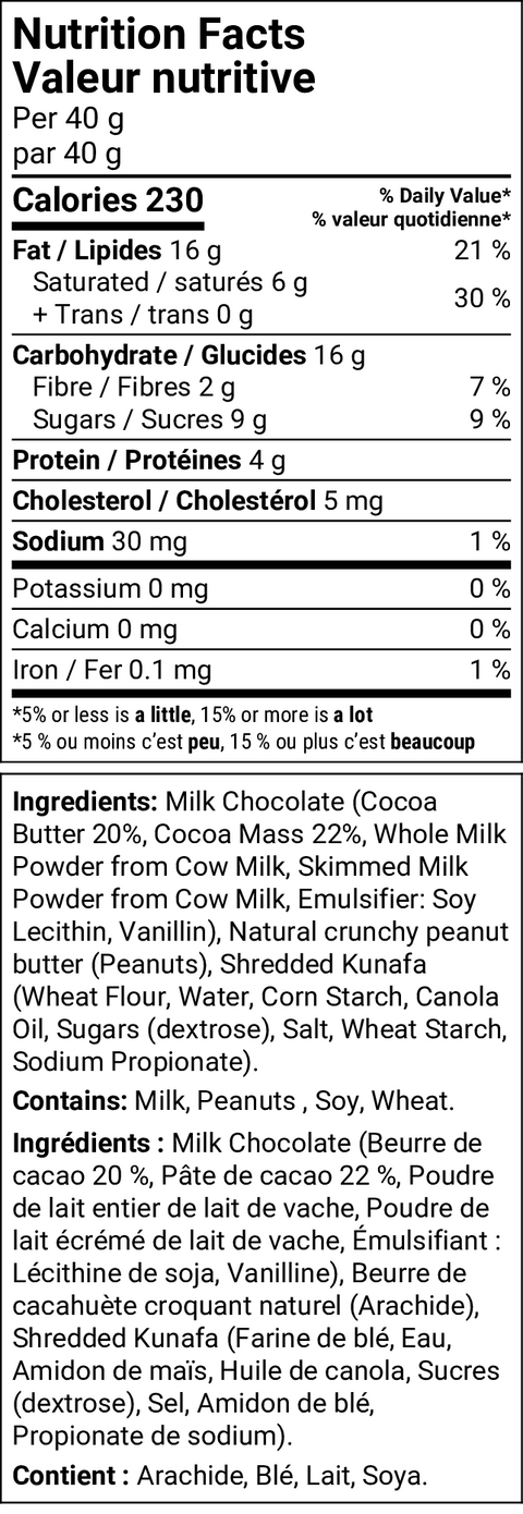 Peanut butter lovers, this one's for you! Our Peanut Butter Dubai Chocolate Bar features layers of crispy knafeh paired with creamy peanut butter filling, topped with a sprinkle of crushed peanuts for that extra crunch. Sweet, salty, and utterly satisfying, it's a bold new take on knafeh. Made with Milk Chocolate!