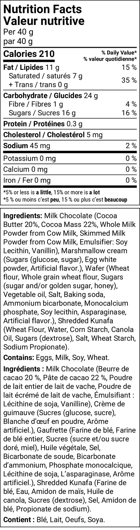 A decadent twist on a classic campfire treat! Our S’mores Dubai Chocolate Bar combines layers of crispy, golden-baked knafeh with a luscious marshmallow filling and a rich chocolate drizzle, all resting on a buttery graham cracker crust. It's the perfect harmony of gooey sweetness and crispy texture, bringing the joy of s’mores to your taste buds—no campfire needed! Made with Milk Chocolate!