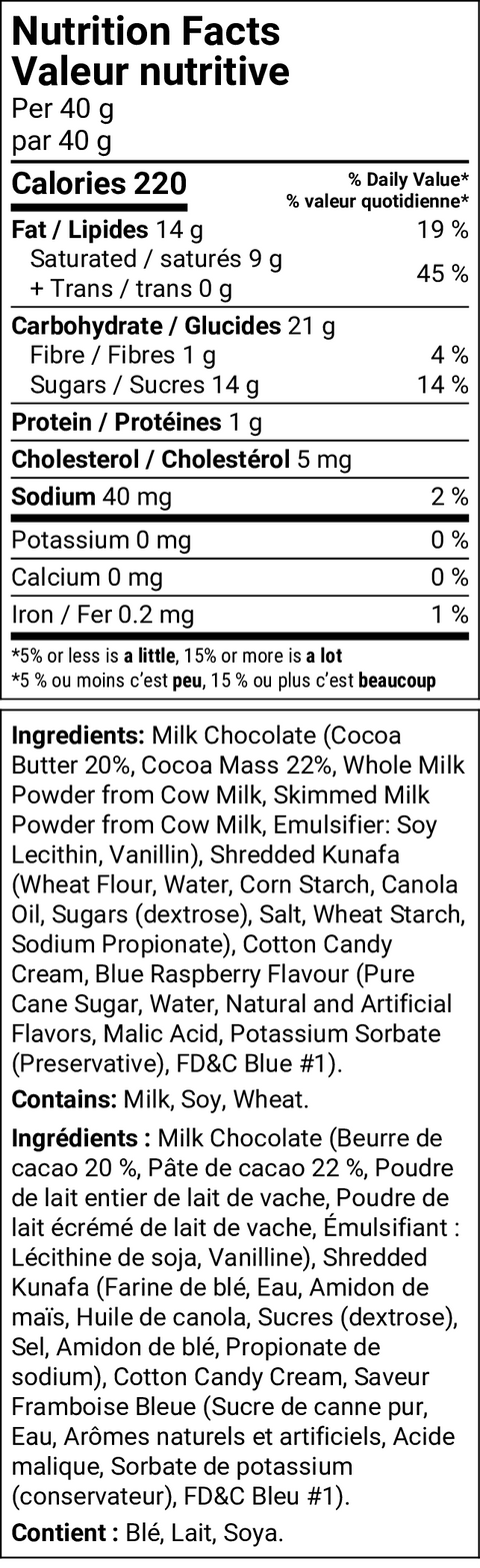 Please note: There is no real cotton candy in this bar, only flavouring and knafeh. If you're looking for the Cotton Candy filled bars, click here.