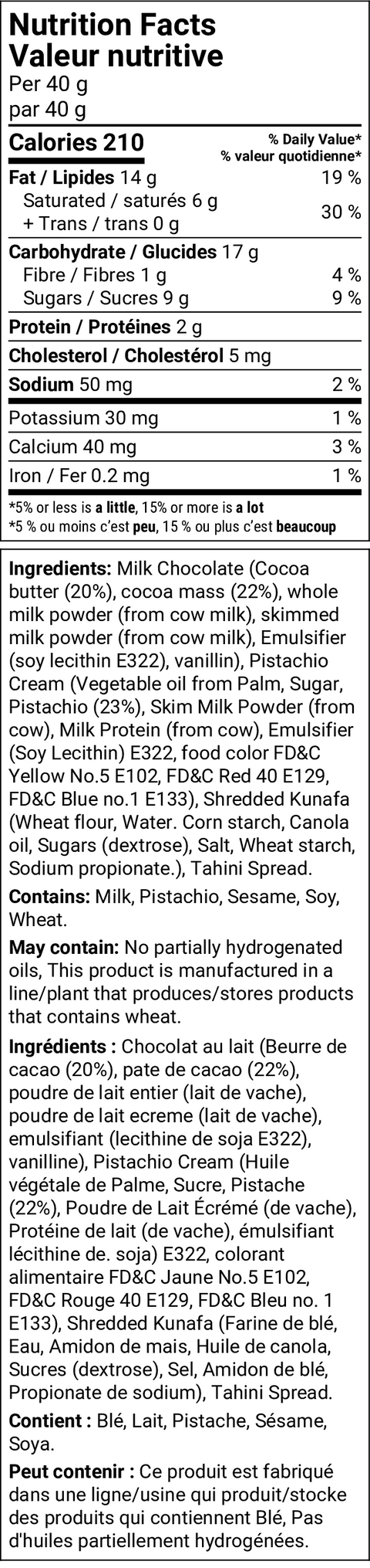 Introducing our Pistachio Dubai Chocolate Bar – a delicious blend of rich, velvety chocolate and the exotic flavours of traditional Middle Eastern knafeh. Each bar features a smooth chocolate shell and a crunchy mix of Pistachio cream, tahini, and knafeh in the center. Available in Milk, White, or Dark chocolate.