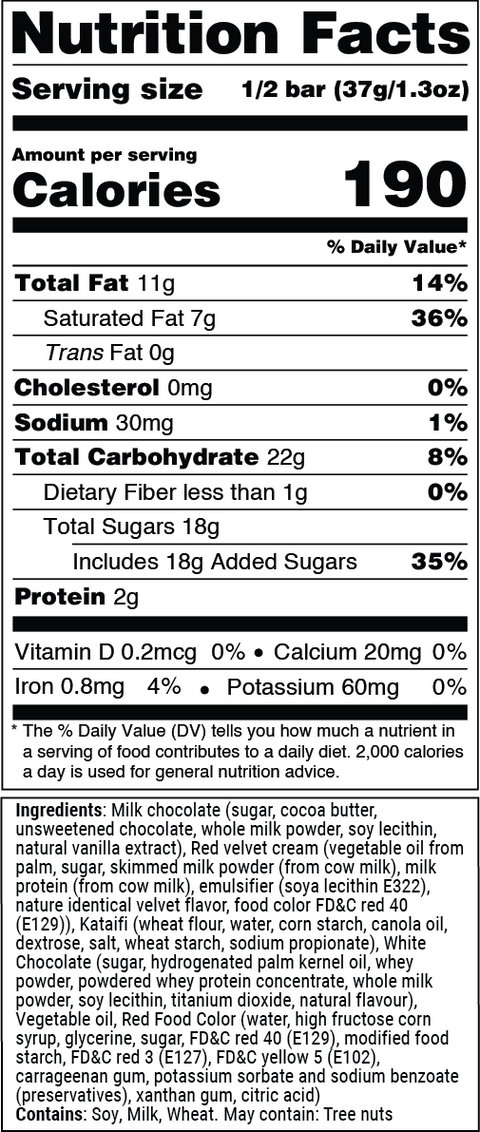 A delicious blend of rich, velvety chocolate and the exotic flavours of traditional Middle Eastern knafeh. Our Red Velvet Dubai chocolate bar features a milk chocolate shell and a red velvet knafeh mix flavouring in the center that blends perfectly.